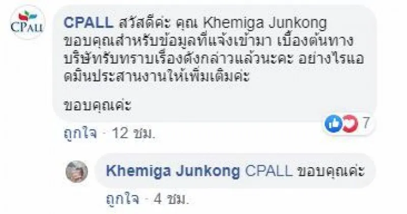 ล่าสุด CPALL 7-Eleven Thailand ได้เข้ามาตอบข้อความของเธอพร้อมรับปากจะตรวจสอบเรื่องแล้ว