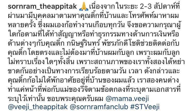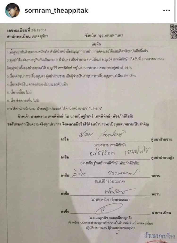 แต่มาวันนี้พี่หนุ่มศร โพสต์ใบหย่าลงไอจีดังตู้มมม พร้อมแจ้งว่าใครที่มีปัญหาเรื่องการเงินหรือธุระอะไรตั่งต่างกับชีติ๊ก ให้ติดต่อชีเลย ไม่ต้องติดต่อมาหาพี่หนุ่มเพราะตอนนี้ไม่ได้อยู่ด้วยกันแล้ว สิ้นสุดสภาพสมรสตามวันที่ที่ระบุบนใบหย่าา