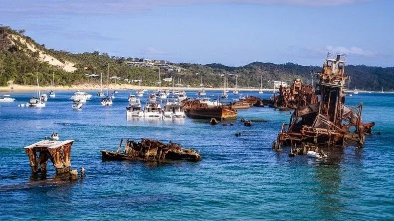 ซากเรือประกอบด้วยเรือสิบห้าลำที่จมลงโดยเจตนาใกล้ชายฝั่งเพื่อสร้างเขื่อนกั้นเรือขนาดเล็กและยังสร้างจุดดำน้ำที่น่าตื่นตาตื่นใจและจุดดำน้ำตื้นในกระบวนการ Tangalooma Wrecks ให้การดำน้ำที่ดีในความลึกตั้งแต่ 2-10 เมตรและการมองเห็นได้ถึง 8 เมตร แม้จะอยู่ในน้ำตื้นแห่งนี้ซากเรือก็ยังดึงดูดสิ่งมีชีวิตในทะเลจำนวนมากได้อย่างน่าทึ่งเช่นนกวูบเบกงทรีแวลคิงฟิชหางเหลืองและปลาเขตร้อนจำนวนมาก