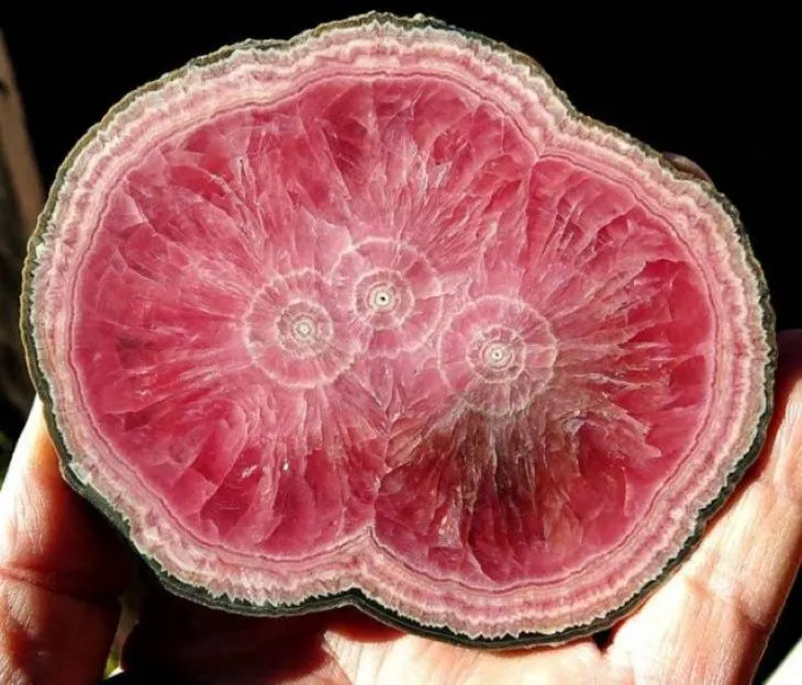 6. คริสตัล Rhodochrosite เกรปฟรุ้ตจากอาร์เจนตินาสร้างขึ้นโดยแกนหินย้อยสามแกนที่เติบโตขึ้นพร้อมกัน