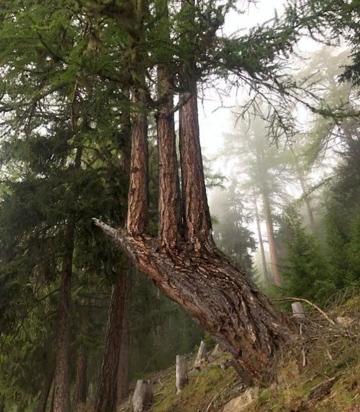 15. ลำต้นของต้นไม้ที่เสียหายฟื้นขึ้นมาด้วยต้นไม้ใหม่สามต้น