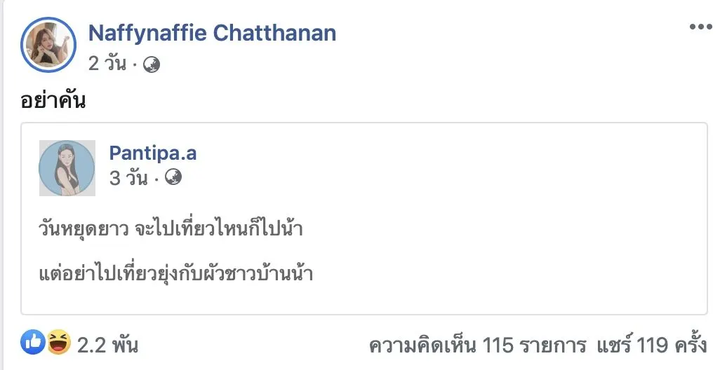 "วันหยุดยาว จะไปเที่ยวไหนก็ไปน้า แต่อย่าไปเที่ยวยุ่งกับผัวชาวบ้านน้า"