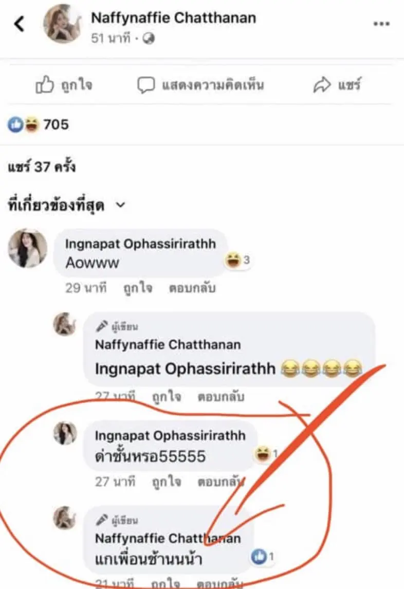 นาฟ ฉัฐนันท์ เถาศิริพันธ์ หลานสาวของนักแสดงชื่อดัง แพท ณปภา ตันตระกูล โดนสาวอิงอิง คู่กรณีของ สาวธัญญ่า ถามทันทีหลัง แชร์ข้อความจาก ปุ้มปุ้ย พรรณทิพา ว่า