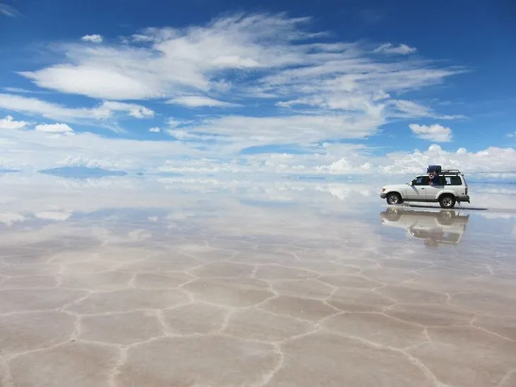Salar de Uyuni มีพื้นที่กว่า 4.000 ตารางไมล์เป็นกระทะเกลือที่ใหญ่ที่สุดในโลก กระทะเกลือหรือแฟลตเกลือเป็นคราบเกลือและแร่ธาตุอื่น ๆ บังเอิญเงินฝากเหล่านี้มีความแวววาวและสะท้อนแสงมากเมื่อเจอกับแสงแดดจึงเป็นที่นิยมในหมู่นักท่องเที่ยว เพื่อให้เห็นภาพที่น่าทึ่งมากขึ้นของ Salar de Uyuni คลิกที่นี่: โลกกระจกที่ใหญ่ที่สุด