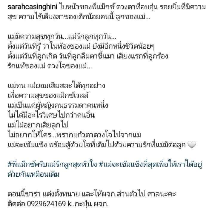 - ตอนนี้สภาพจิตใจตอนนี้ย่ำแย่ ที่ผ่านมาซาร่าดูแลแม็กซ์เวลล์มาตั้งแต่เกิด พอมีคำร้องมาบางอย่างที่น้องซาร่ารู้สึกไม่เห็นด้วย เลยแต่งตั้งทนายขึ้นมาเพื่อคัดค้านและนัดไกล่เกลี่ยอีกรอบ