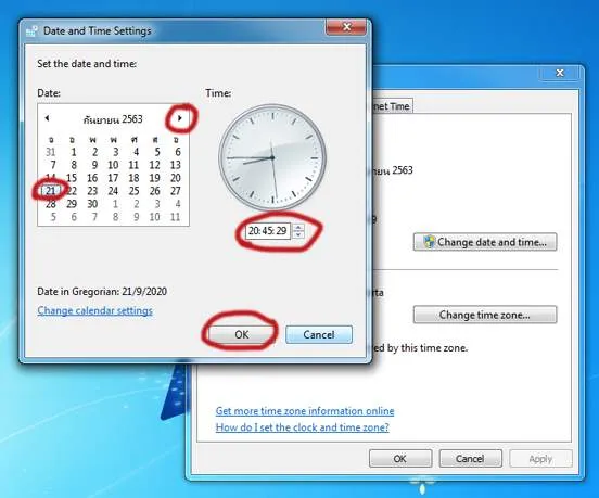 5. ทำการเปลี่ยนเดือนโดยคลิกที่ลูกศรเล็กๆ (มีทั้งซ้ายและขวา) , เปลี่ยนวันที่ให้ตรงกับปัจจุบัน , เปลี่ยนเวลา จากนั้นกดคำว่า OK