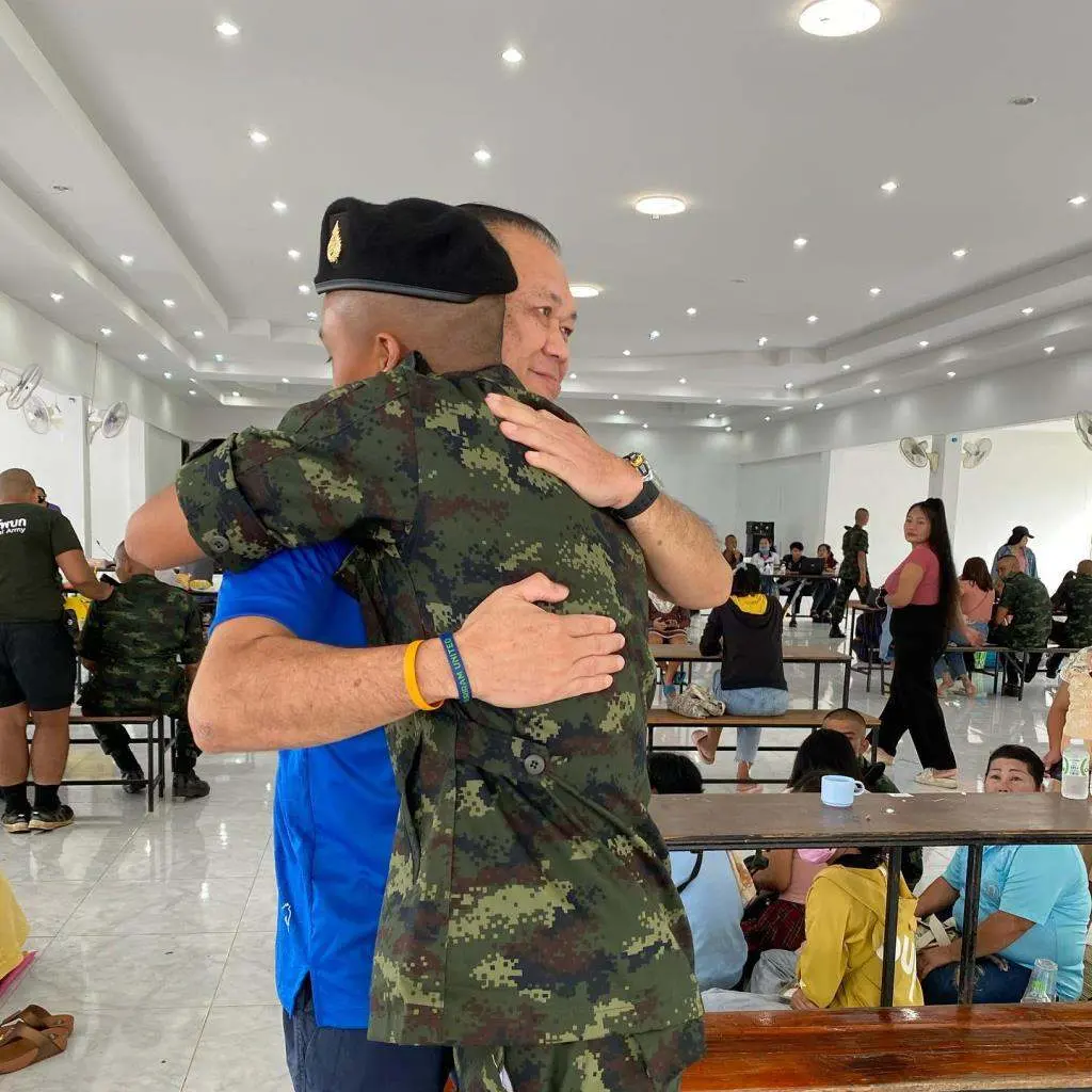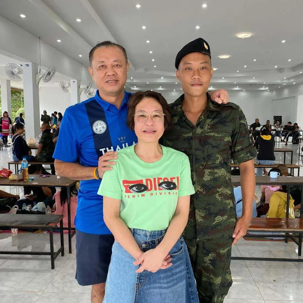 โดยประธานสโมสร "ปราสาทสายฟ้า" ได้สวมกอดลูกชายอย่างอบอุ่น พร้อมกันนี้ "ซ้อต่าย" โพสต์ข้อความแบบติดตลกว่า "น้องแน่น พลทหาร ญาติเยอะ"