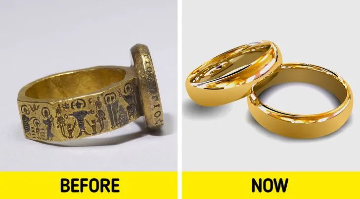 ประเพณีการสวมแหวนแต่งงานมีอายุหลายพันปี: แหวนที่มีลักษณะคล้ายกันวงแรกพบในอียิปต์โบราณ และภาพด้านซ้ายแสดงแหวนจากศตวรรษที่ 6
