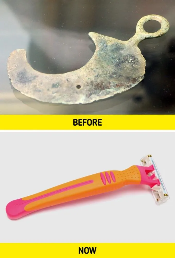 มีดโกนแรกพบในหลายวัฒนธรรมของยุคสำริด เป็นแผ่นโลหะรูปพระจันทร์ครึ่งเสี้ยวบาง ๆ คุณสามารถเห็นหนึ่งในนั้นในภาพด้านบน