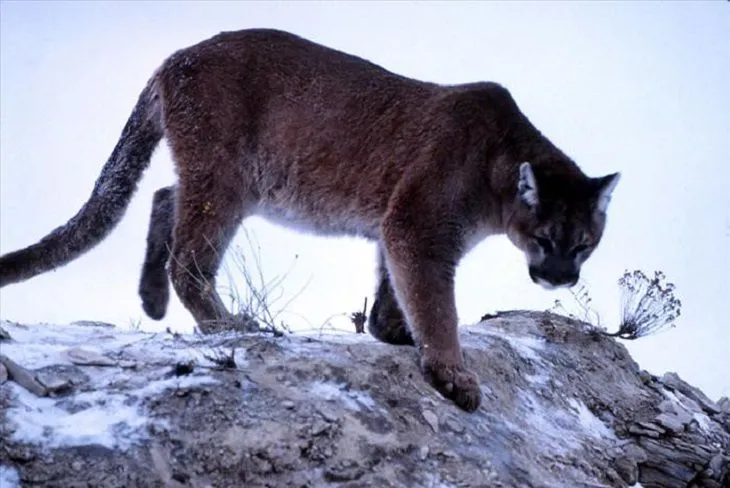 สิงโตภูเขากำลังเดินไปตามหินอย่างระมัดระวัง สิงโตภูเขาหรือที่เรียกว่า เสือภูเขาเป็นสมาชิกที่ใหญ่ที่สุดในตระกูลแมวที่อาศัยอยู่ในเยลโลว์สโตน สิงโตภูเขาสามารถมีน้ำหนักได้มากถึง 200 ปอนด์ (~ 90 กก.) แม้ว่าสิงโตในเยลโลว์สโตนจะมีน้ำหนักระหว่าง 140 ถึง 160 ปอนด์ (~ 65 และ ~ 70 กก.) สำหรับตัวผู้และประมาณ 100 ปอนด์ (45 กก.) สำหรับตัวเมีย