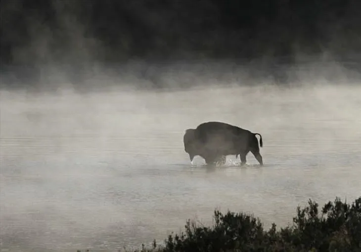 วัวกระทิงกำลังข้ามแม่น้ำเยลโลว์สโตน วัวกระทิงอาศัยอยู่ในพื้นที่ของเยลโลว์สโตนมาตั้งแต่สมัยก่อนประวัติศาสตร์พวกมันเป็นชนพื้นเมืองของดินแดนนี้อย่างแท้จริงและถูกล่าและนับถือโดยชนพื้นเมืองอเมริกัน ฝูงเยลโลว์สโตนเป็นหนึ่งในไม่กี่ตัวในโลกที่ไม่มียีนของวัวผสมโดยมนุษย์