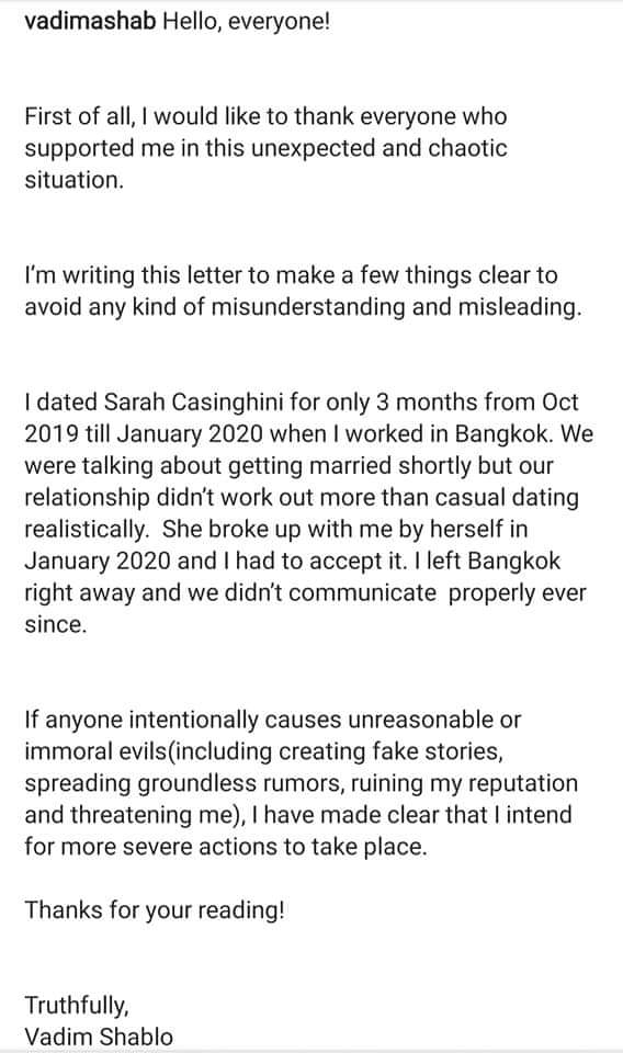ผมคบกับ Sarah Casinghini เพียงแค่ 3 เดือน ตั้งแต่ตุลาคม 2019 ถึงมกราคม 2020 ตอนที่ผมทำงานในกรุงเทพฯ เราเคยพูดถึงการแต่งงานอยู่บ้าง แต่จริงๆแล้ว ความสัมพันธ์ของเราไม่ได้มีความคืบหน้าไปมากกว่าการคบกันแบบไม่จริงจังนัก เธอเป็นฝ่ายบอกเลิกกับผมด้วยตัวเองในเดือนมกราคม 2020 และผมต้องยอมรับมัน ผมออกจากกรุงเทพฯทันทีและเราไม่เคยได้คุยกันดีๆตั้งแต่นั้นเป็นต้นมา