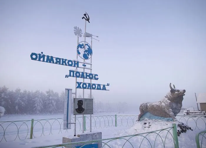 ป้ายหมู่บ้าน: Oymyakon - "Pole of Cold"