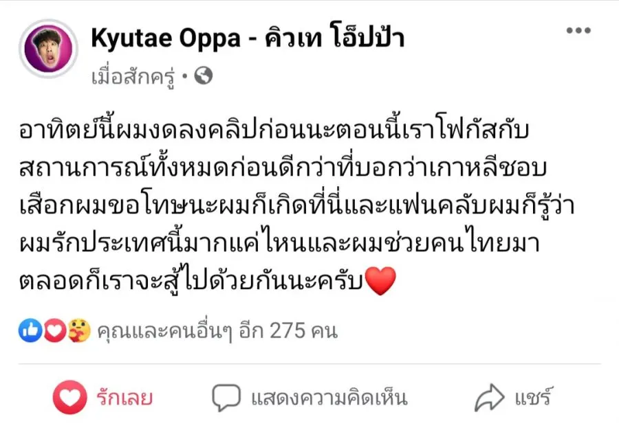 คิวเทโอ้ปป้า ยอมรับอินการเมืองของไทยมากๆ ในตอนนี้ งดอัพคลิปติดตามสถานการณ์