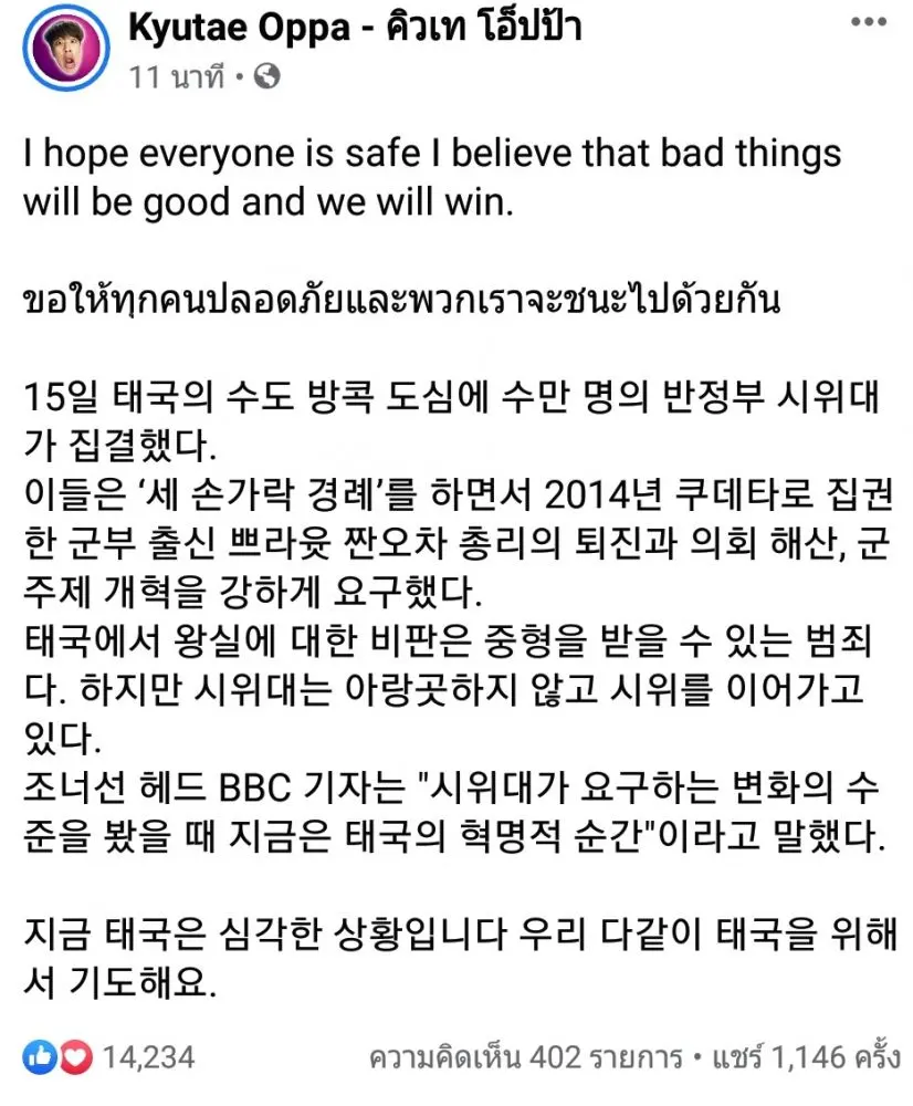 เน็ตไอดอลชาวเกาหลีแท้ ๆ ที่มีคนฟอลโล่วเพจเป็นหลักล้านประกาศจุดยืน และช่วยเป็นกระบอกเสียงให้กับคนไทย จนได้ใจชาวเน็ตเป็นอย่างยิ่ง ทำให้อดเทียบกับดารา เน็ตไอดอล ยูทูปเบอร์ และอินฟูลเอนเซอร์ไทยไม่ได้เลยว่าทำไมยังนิ่งเฉย เพิกเฉยกับสถานการณ์แบบนี้อยู่ได้ ให้คำยึดมั่นเสร็จสรรพ ไม่สนว่าใครว่า "เสือ-ก" ด้วย เพราะตนเป็นคนเกาหลีที่เกิดที่ไทยและรักประเทศไทยมาก
