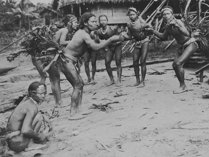 กลุ่มชาย Mentawai วาดภาพไก่ในงานเต้นรำประมาณปี 1900–1940