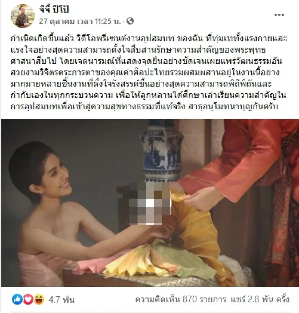จากกรณี จีจี้ปีโป้ หรือ นายธีรชัย คงทอง เจ้าของร้านเพชรทองศิวาลัย ย่านบางกะปิ ร้านทองชื่อดัง จัดงานอุปสมบทของตนเอง ที่อ.บันนังสตา จ.ยะลา ระหว่างวันที่ 3 -5 พฤศจิกายน อย่างยิ่งใหญ่ โดยเนรมิตฉากละครพีเรียดย้อนยุค มีการแบกหามขึ้นเสรี่ยง อีกทั้งยังมีเครื่องทรง มงกุฏ พร้อมกับมีการบันทึกภาพนิ่ง วีดีโอเอาไว้ และมีการจัดงานคอนเสิร์ตมีศิลปินชื่อดังมากมาย