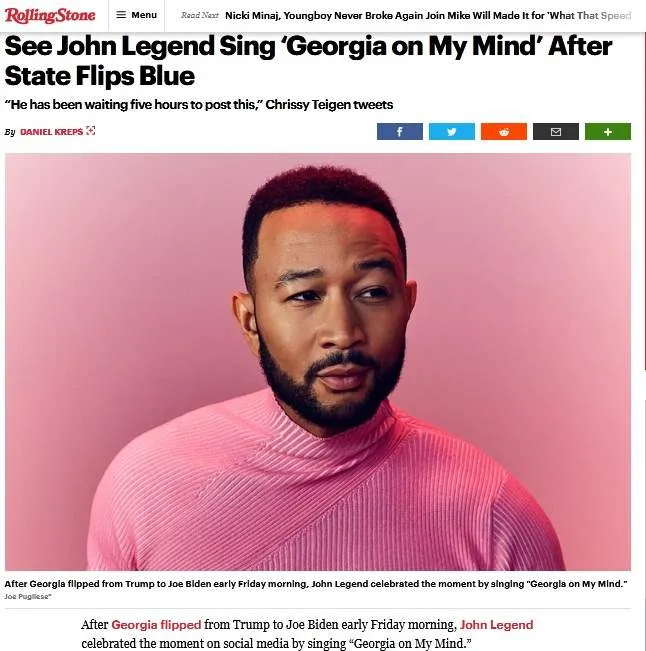 เขยโคราช JOHN LEGEND ศิลปินเพลงระดับโลก ร้องเพลง Georgia On My Mind ลงทวิตเตอร์ หลังไบเด้นชนะทรัมป์เป็นครั้งแรกของเดโมแครตในรัฐนี้นับตั้งแต่ 1992