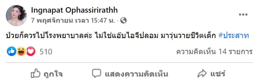 เมื่อวันที่ 7 พ.ย. 63 ผู้ใช้ เฟสบุค Ingnapat Ophassirirathh หรือ อิงอิง อิงณภัสร์ ที่เคยมีข่าวกับดาราสาวตัวแม่ ธัญญ่าธัญญาเรศ เธอได้โพสข้อความ ว่า "ป่วยก็ควรไปโรงพยาบาลค่ะ ไม่ใช่แอ๊บไอจีปลอม มาวุ่นวายชีวิตเด็ก #ประสาท"