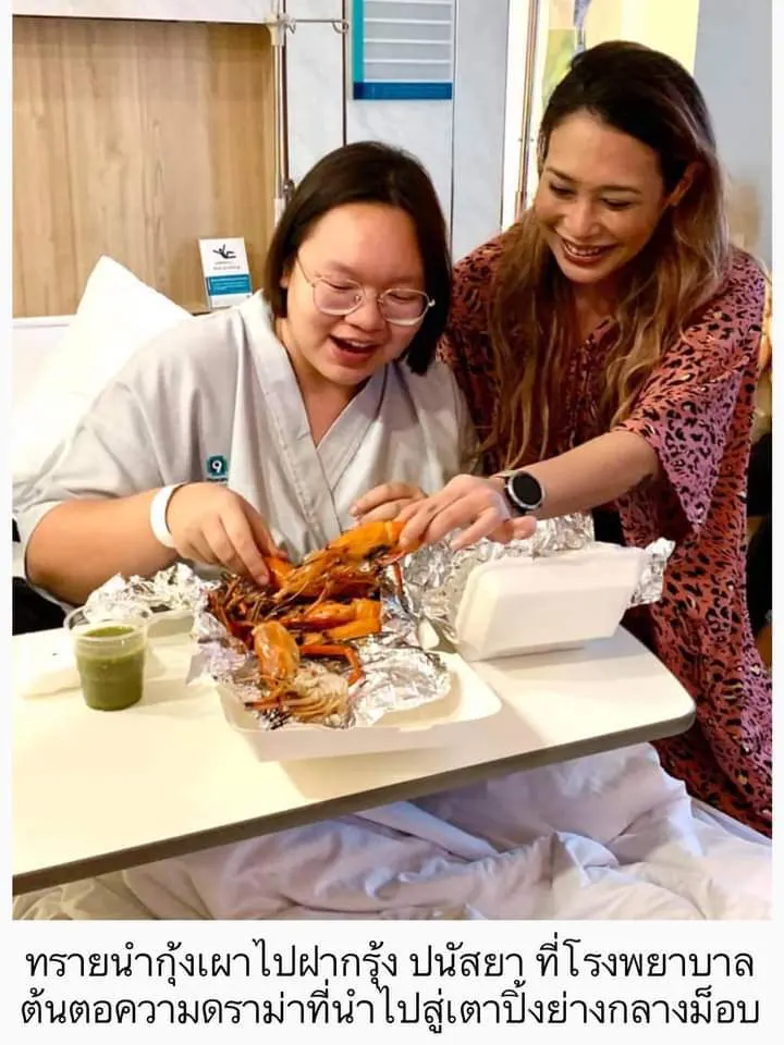 8- ภาพนี้ของทรายถูกแชร์ต่อในกลุ่มผู้สนับสนุนรัฐบาล และกลายเป็นดราม่าเมื่อถูกมองว่ามีคนเป็นท่อน้ำเลี้ยงอยู่เบื้องหลัง ถึงได้มีเงินซื้อกุ้งเผาตัวใหญ่ราคาแพงขนาดนี้ไปให้ทานได้