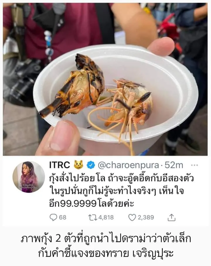17- ฝั่งผู้ชุมนุมก็โต้กลับว่า แหม บอกว่ากุ้งตัวเล็ก ไม่อร่อย แต่ก็กินจนเหลือแต่เปลือก ขนาดหัวกุ้งยังถูกดูดจนแห้ง