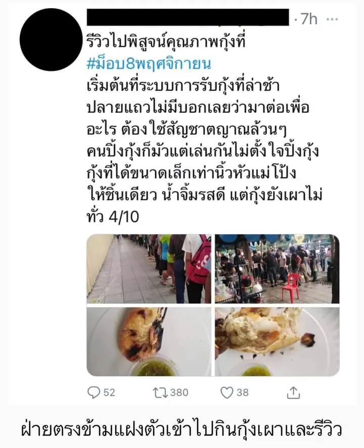 16- แต่ดราม่าก็ยังไม่จบอีก เมื่อคนที่เป็นฝ่ายสนับสนุนรัฐบาลได้แฝงตัวเข้ามาในม็อบเพื่อทดลองกินกุ้งเผาของทราย ก่อนโพสต์ภาพและรีวิวว่า กุ้งที่เขาได้กินนั้นตัวเล็กจนเหมือนกุ้งแห้งและไม่อร่อย ให้คะแนน 4/10 และจะไม่มากินอีก