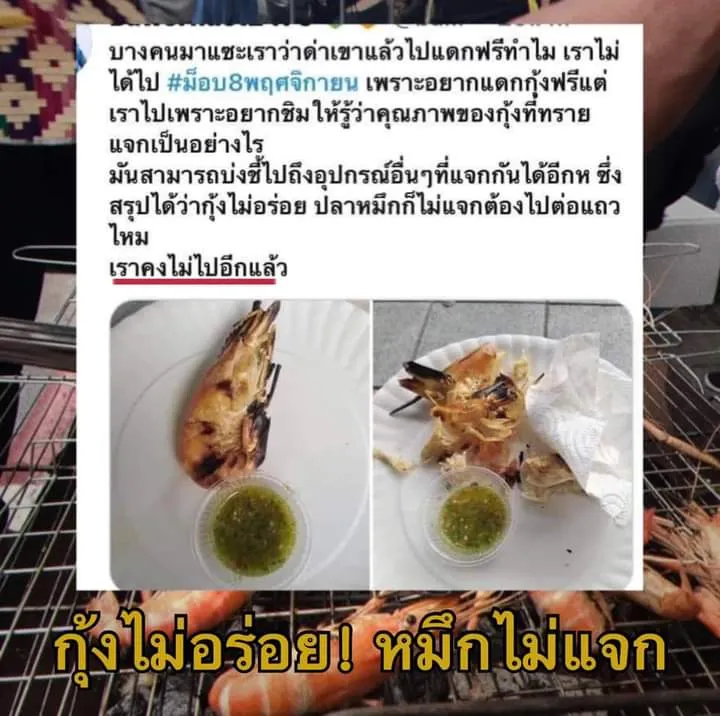 18- นอกจากนี้ยังมีดราม่าภาพถ่ายกุ้งเผา 2 ตัวที่ดูตัวเล็ก จนฝ่ายตรงข้ามนำไปแชร์ต่อกันอย่างคึกคัก