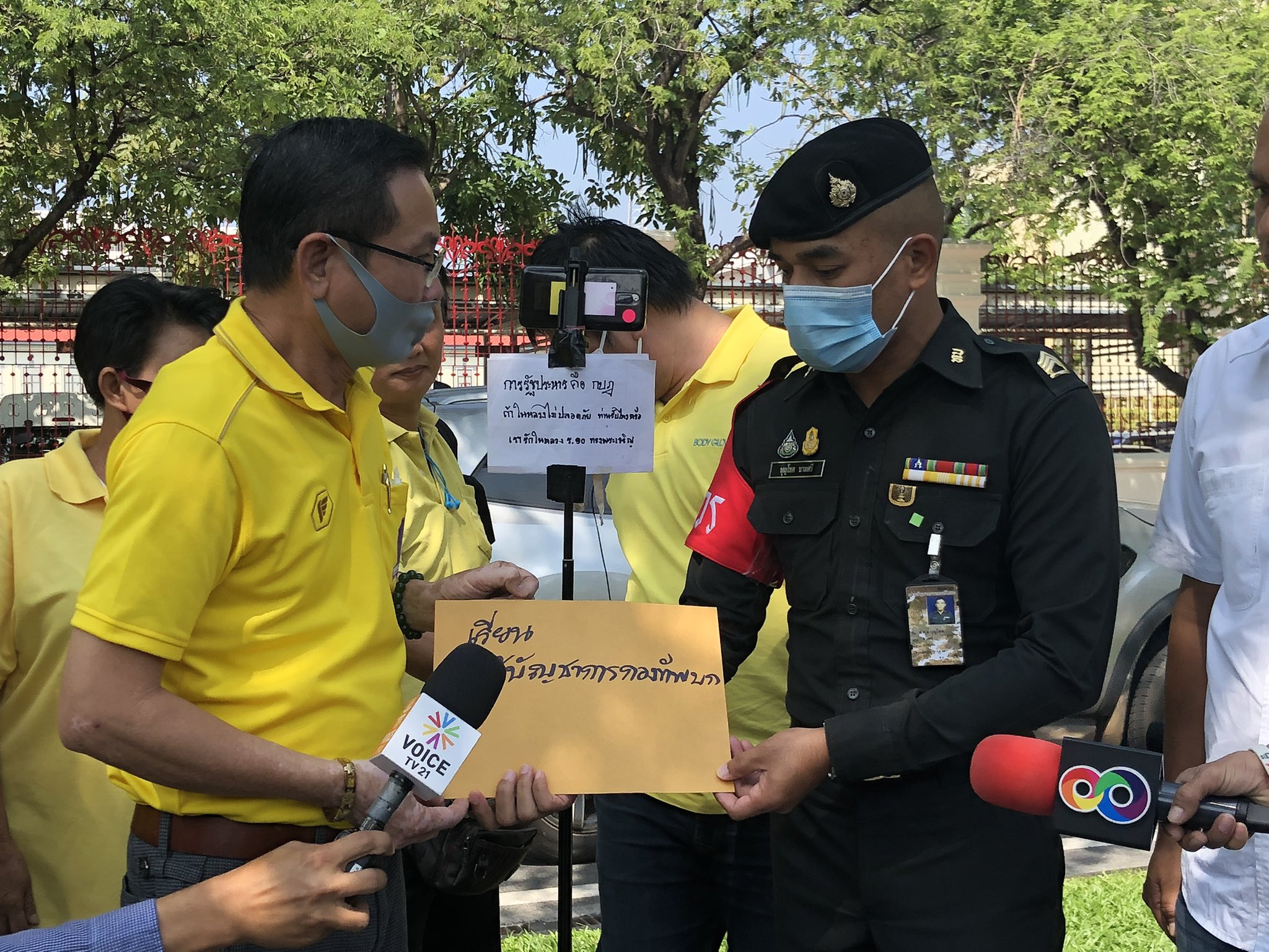 ตอนให้สัมภาษณ์ ปรากฏว่ามีชายเสื้อเหลือง ยืนแทรก ถือป้าย “การรัฐประหารคือกบฏ” โดยชายที่ถือป้ายนี้ หากยังจำกันได้คือ ลุงเล็กเสื้อเหลืองที่ประกาศไม่เอารัฐบาลเผด็จการแล้วโดนม็อบหมอเหรียญทองขับไล่นั่นเอง