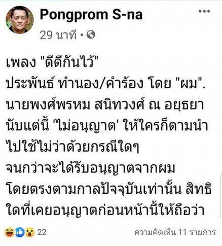 "ปุ้ม พงศ์พรหม สนิทวงศ์ ณ.อยุธยา" โปรดิวเซอร์ นักแต่งเพลงชื่อดังและอดีตสมาชิกวง "ตาวัน" โพสต์เฟซบุ๊กส่วนตัว ระบุถึงการใช้เพลงที่เจ้าตัวเขียนว่า