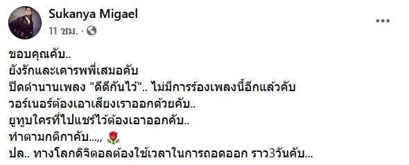 "สุกัญญา มิเกล" โพสต์ขอบคุณ ผู้แต่งเพลง "ดีดีกันไว้" หลังประกาศห้ามใครก็ตามนำไปใช้