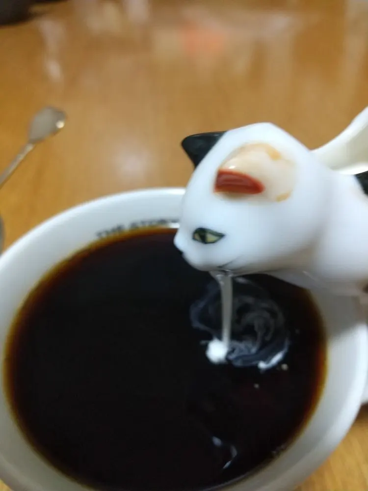 ของใช้บนโต๊ะกินกาแฟ หากว่าน่ารักดูดี ก็จะชวนให้อารมณ์ในการดื่มกาแฟสุนทรีย์ยิ่งขึ้น แต่กับผู้ใช้ทวิตเตอร์ @jctakashi ได้ของชิ้นนี้มา เป็นรูปเหยือกนมใส่กาแฟรูปแมวซึ่งก็น่ารักมาก แต่พอเอามาใช้งานจริงๆ แล้ว มันออกจะดูแหวะๆ ไปสักหน่อยนะ (゚A゚;) เหมือนแมวกำลังอ้วกใส่กาแฟไปซะอย่างนั้น
