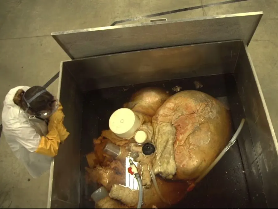 นักวิทยาศาสตร์จะฉีดฟอร์มาลดีไฮด์ (Formaldehyde) เข้าไปในหัวใจเพื่อยุติการย่อยสลาย ก่อนที่จะนำไปแช่ในอาซีโทน (Acetone) เพื่อรีดน้ำออกมาจากเนื้อเยื่อ ในช่วงเวลา 6 เดือน อาซีโทน (Acetone) จะเข้าแทนที่โมเลกุลน้ำ