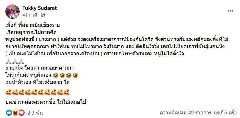 "ตุ๊กกี้" กราบขอโทษ หลัง ปวดขี้หนัก ตอนลงเครื่อง วิ่งเบียดคน ไปห้องน้ำ