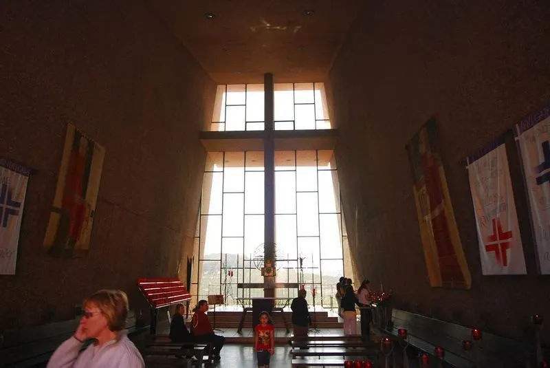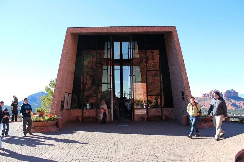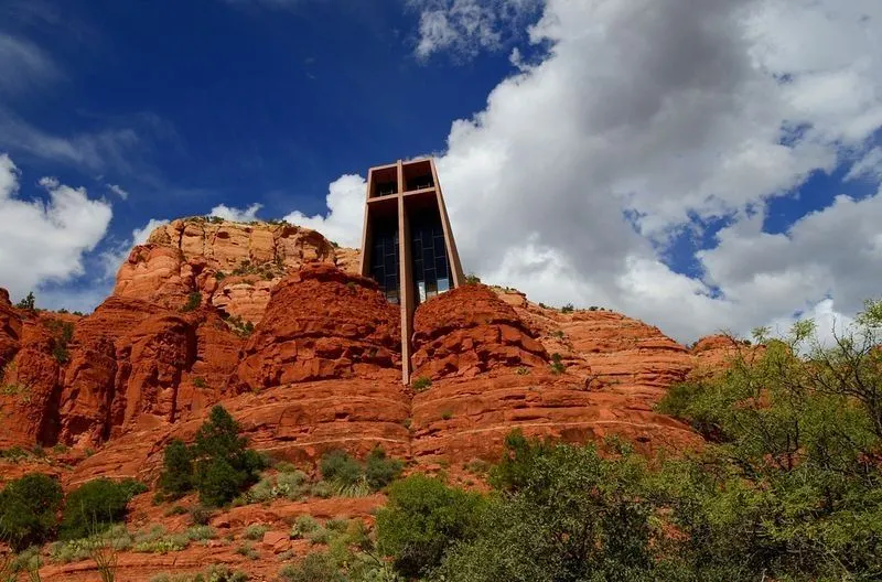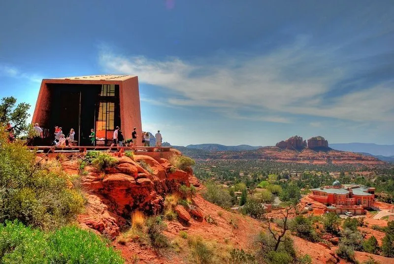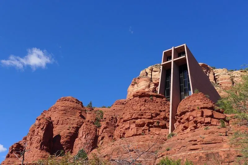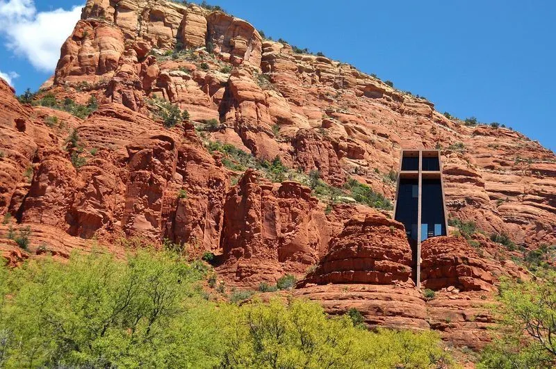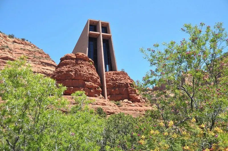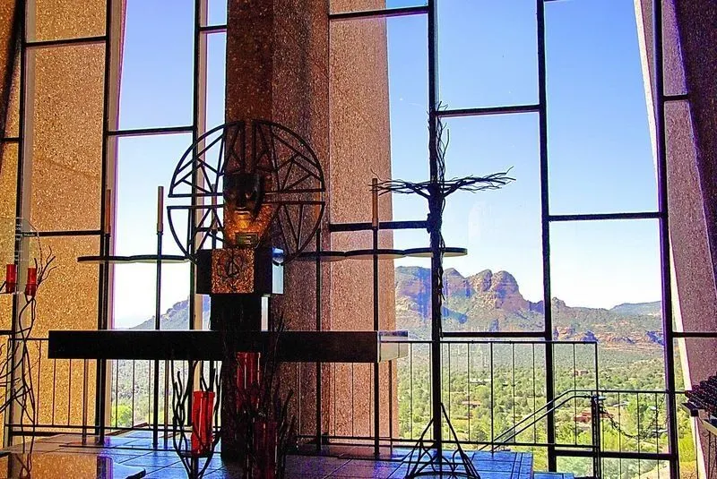Chapel of the Holy Cross ที่ยื่นออกมาจากกำแพงหินทรายสีแดงในทะเลทรายแอริโซนาซึ่งอยู่ใกล้กับเมือง Sedona เป็นสถาปัตยกรรมสมัยใหม่ที่น่าอัศจรรย์ โบสถ์นิกายโรมันคา ธ อลิกได้รับการออกแบบโดยลูกศิษย์ของ Frank Lloyd Wright ประติมากรมาร์เกอริตบรันสวิกสเตาด์ซึ่งได้แรงบันดาลใจในการออกแบบจากตึกเอ็มไพร์สเตทที่สร้างขึ้นใหม่ในนิวยอร์ก โบสถ์แห่งนี้ตั้งอยู่เหนือหุบเขาเกือบ 200 ฟุต การตกแต่งภายในนั้นเรียบง่ายมากโดยไม่มีอะไรมากไปกว่าม้านั่งและการดัดแปลง ไม่มีการจัดบริการแบบดั้งเดิมภายในโบสถ์เนื่องจากเป็นสถานที่แห่งการไตร่ตรองและทำสมาธิ