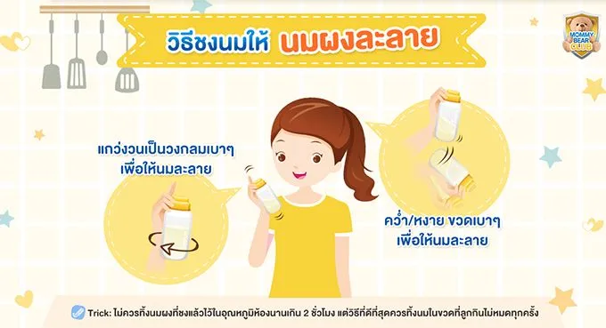 เมื่อใส่น้ำต้มสุกและนมผงลงในขวดนมแล้ว ธรรมดาคุณแม่บางทีอาจจะใช้วิธีเขย่าขึ้นลงแรงๆเพื่อนมผงละลาย ซึ่งวิธีนี้อาจทำให้เกิดฟองอากาศมาก นำมาซึ่งการทำให้ลูกดูดฟองอากาศเข้าไป เกิดเป็นก๊าซในกระเพาะ อาจจะส่งผลให้ลูกไม่สบายท้อง ท้องเฟ้อได้ แม่จำเป็นจะต้องใช้วิธีแกว่งวนเป็นวงกลมเบาๆหรือใช้วิธีคว่ำ – หงาย ขวดเบาๆเพื่อนมละลาย ได้โดยที่ไม่เกิดฟอง ถ้าเกิดฟองอากาศให้ตั้งขวดนมทิ้งเอาไว้สักครู่ก็เพียงพอแล้ว ที่สำคัญนมที่เหลือจากการดูดควรปิดฝาครอบให้สนิททุกครั้ง และไม่ควรทิ้งนมผงที่ชงแล้วเอาไว้ภายในอุณหภูมิปกตินานเกิน 2 ชั่วโมง เนื่องจากว่าแบคทีเรียจะเติบโตเพิ่มจำนวนขึ้น ซึ่งทำให้เสี่ยงต่อสุขภาพของลูก ฉะนั้น แนวทางที่ดีที่สุดควรจะทิ้งนมในขวดที่ลูกกินไม่หมดทุกครั้งนะคะ
