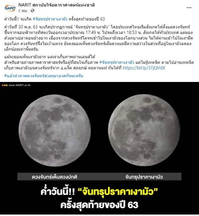 วันที่ 30 พฤศจิกายน ทางเพจ NARIT สถาบันวิจัยดาราศาสตร์แห่งชาติ ได้มีการเชิญชวนคนไทย ชมจันทรุปราคาเงามัว โดยระบุว่า