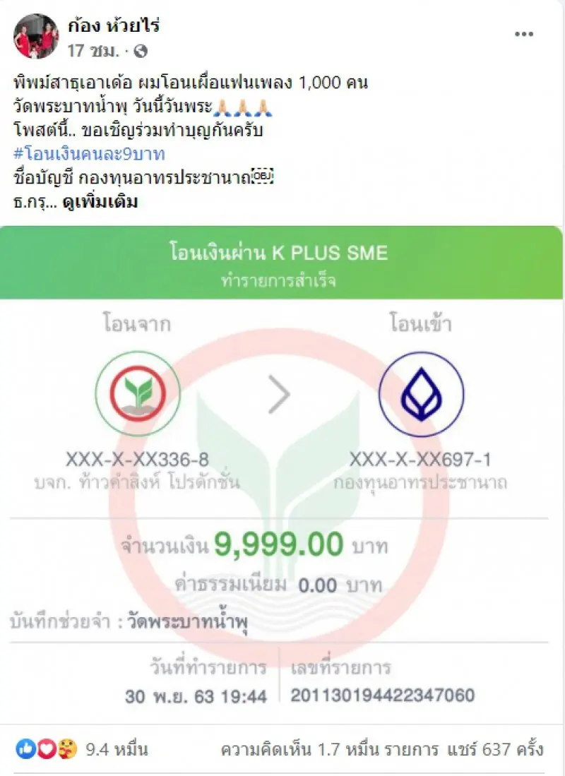 ล่าสุด หนุ่ม ก้อง ห้วยไร่ ร่วมทำบุญบริจาค ช่วยเหลือวัดพระบาทน้ำพุ หลังสถานการณ์กำลังแย่ โดย ก้อง ได้บริจาคเงินถึง 9,999 บาท พร้อมกับระบุข้อความว่า " พิพม์สาธุเอาเด้อ ผมโอนเผื่อแฟนเพลง 1,000 คน วัดพระบาทน้ำพุ วันนี้วันพระ โพสต์นี้.. ขอเชิญร่วมทำบุญกันครับ #โอนเงินคนละ9บาท ชื่อบัญชี กองทุนอาทรประชานาถ ธ.กรุงเทพ 289084697 โพสต์ดังกล่าว ขอบคุณ ก้อง ห้วยไร่"