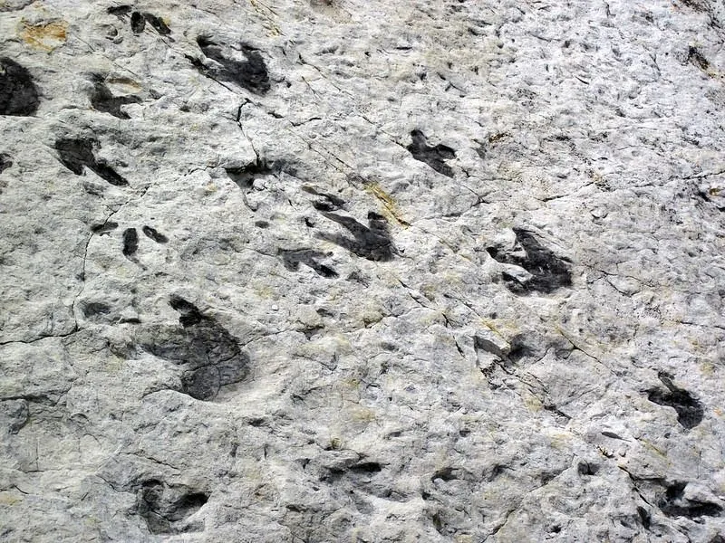 หนึ่งในรอยเท้าไดโนเสาร์หลายแห่งที่ Dinosaur Ridge แทนที่จะเป็นที่ลุ่มในหินรอยเท้านี้จะนูนขึ้น ไดโนเสาร์อาจจะเหยียบลงไปในพื้นดินที่อ่อนนุ่มซึ่งต่อมาเต็มไปด้วยทรายและโคลนที่แข็งตัว หินที่อ่อนนุ่มกว่ารอบ ๆ ความประทับใจได้กัดเซาะออกไปจนเหลือ แต่รอยนูน เครดิตภาพ: Mark Ryan / Flickr