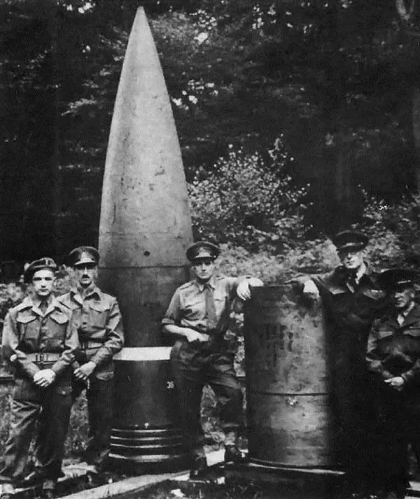 ทหารสหรัฐกำลังวัดลำกล้องของสิ่งที่เหลืออยู่ของปืนกุสตาฟหลังจากถูกเยอรมันระเบิด