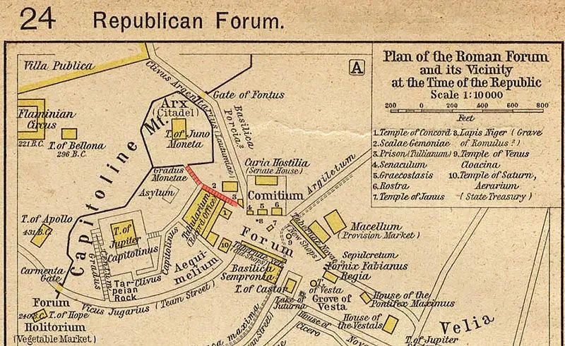 แผนที่ของ Roman Forum ที่มี Scalae Gemoniae เน้นด้วยสีแดง