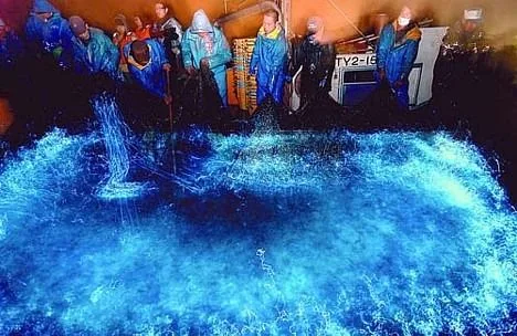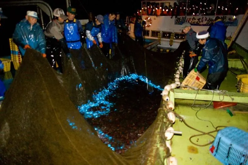 เช้าตรู่หลัง 3:00 น. เรือเที่ยวชมจะออกจากท่าเรือประมง Namerikawa (Namerikawa ยังเป็นที่ตั้งของพิพิธภัณฑ์แห่งเดียวในโลกที่อุทิศให้กับปลาหมึกหิ่งห้อย) ในจังหวัดโทยามะโดยใช้เวลาเดินทางสั้น ๆ ไปยังอวนถาวรซึ่งอยู่ห่างจากฝั่งประมาณ 1 ถึง 2 กม. . ในขณะที่ชาวประมงลากอวนออกไปแสงที่ปล่อยออกมาจากปลาหมึกหิ่งห้อยทำให้ผิวน้ำทะเลเรืองแสงเป็นสีฟ้าโคบอลต์กระตุ้นให้เกิดความยินดีจากนักท่องเที่ยว