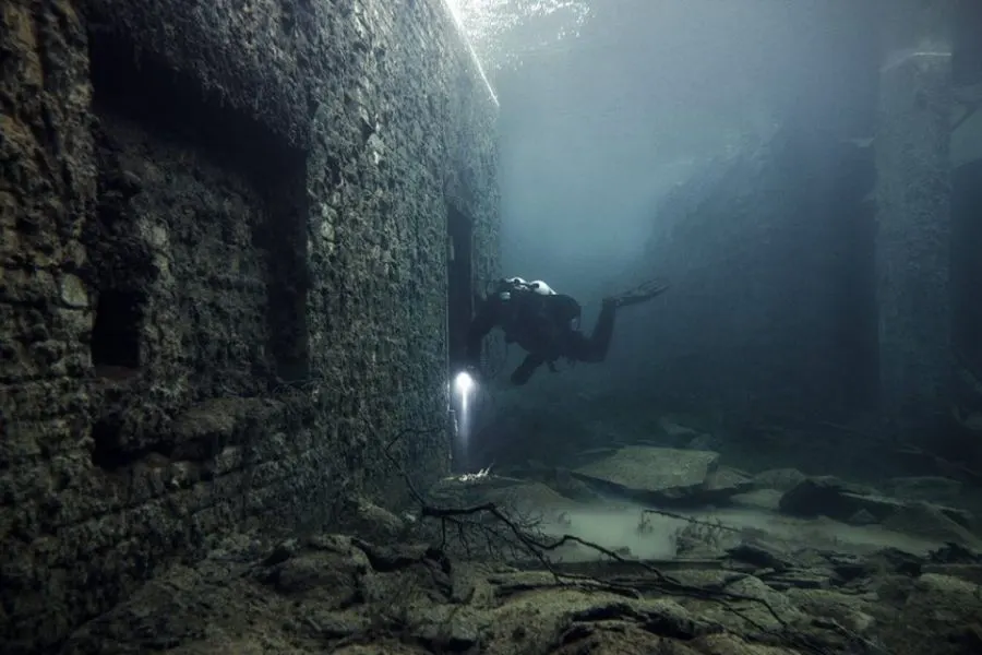 “ เราวนรอบอาคารที่ใหญ่ที่สุดใต้น้ำบางส่วนของอาคารหลังนี้อยู่เหนือตลิ่ง การมองเห็นในน้ำนั้นพอใช้ แต่แสงแดดในตอนกลางวันเผยให้เห็นผนังและรูปทรงของอาคารที่อยู่ตรงหน้าเรา เราว่ายน้ำเข้ามาจากทางเข้าประตูขนาดใหญ่ภายในชั้นใต้ดินของอาคารที่มีหลังคายุบบางส่วน บางห้องอยู่ใต้น้ำอย่างสมบูรณ์ ห้องพักเต็มไปด้วยคอนกรีตและความมืด แถบยังคงอยู่ในหน้าต่าง แม้ว่าอาคารจะเป็นสีเทา แต่ความเขียวของน้ำที่แทรกซึมเข้ามาก็ทำให้ทัศนียภาพอันอบอุ่น ธรรมชาติได้ครอบครองโลกนี้เมื่อนานมาแล้ว”