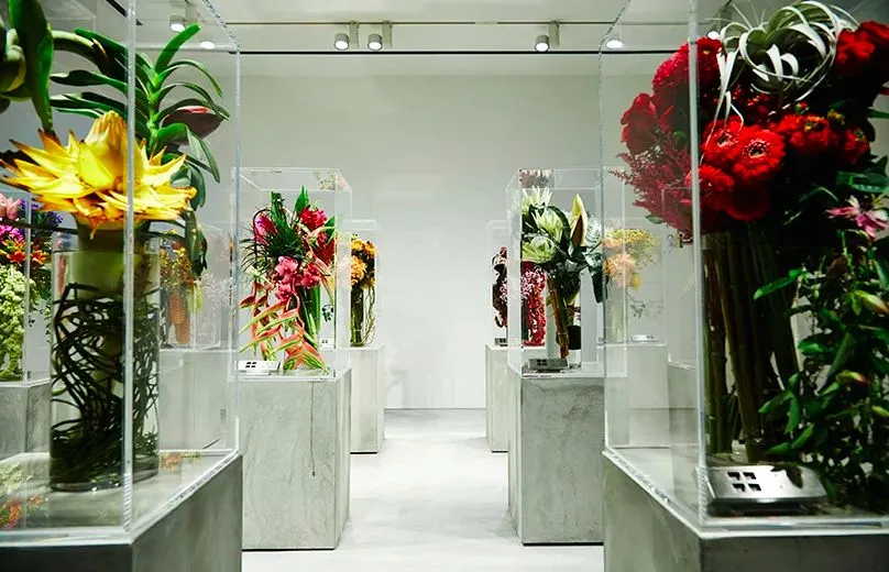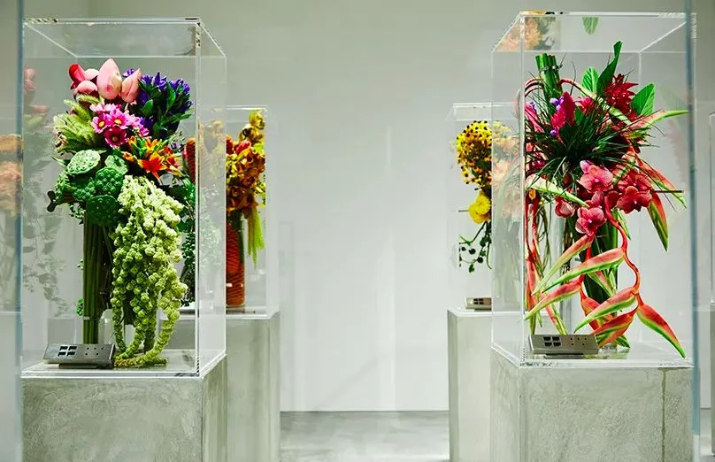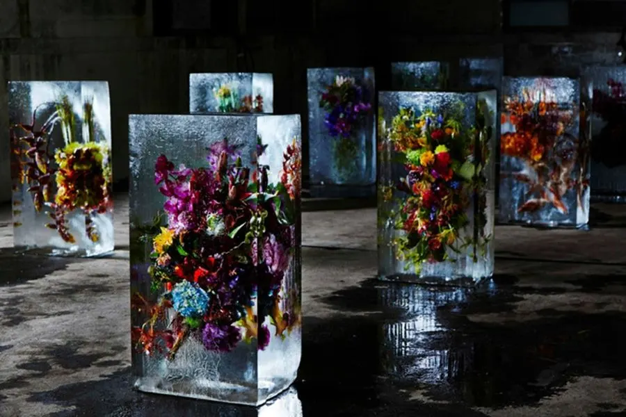 ศิลปินAzuma Makotoเป็นที่รู้จักจากการผสมผสานดอกไม้สดและไม้ตัดดอกเถาวัลย์ต้นบอนไซและแม้แต่ต้นปาล์มเต็มขนาดไว้ในผลงานศิลปะทางพฤกษศาสตร์ของเขาซึ่งมักจะตัดกันธีมของความมีชีวิตชีวาและความเสื่อมโทรม สำหรับการจัดแสดงชื่อ 'Drop Time' ที่ Mass Gallery ในโตเกียว Makoto ได้สร้างช่อดอกไม้ที่สวยงามและวางไว้ในกล่องอะคริลิกเพื่อให้สามารถสังเกตเห็นการสลายตัวช้าของพวกมันได้ในทุกขั้นตอน ส่วนจัดแสดงดอกไม้อีกแห่งหนึ่งคือ 'Iced Flowers' ซึ่งเก็บรักษาช่อดอกไม้ไว้ชั่วคราวในก้อนน้ำแข็ง