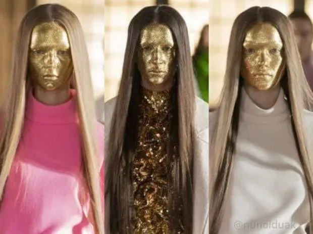 ในขณะที่นางแบบสวมรองเท้าส้นตึกมันวาวใบหน้าของพวกเธอบางส่วนถูกปกคลุมไปด้วยกลิตเตอร์และอื่น ๆ ด้วยไฮไลต์สีทองยิ่งทำให้ดูโดดเด่นขึ้นอีกขั้น