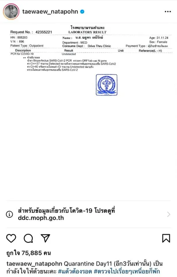 และชีได้โพสต์ภาพผลตรวจเชื้อครั้งที่ 3 ออกมาเป็นลบ