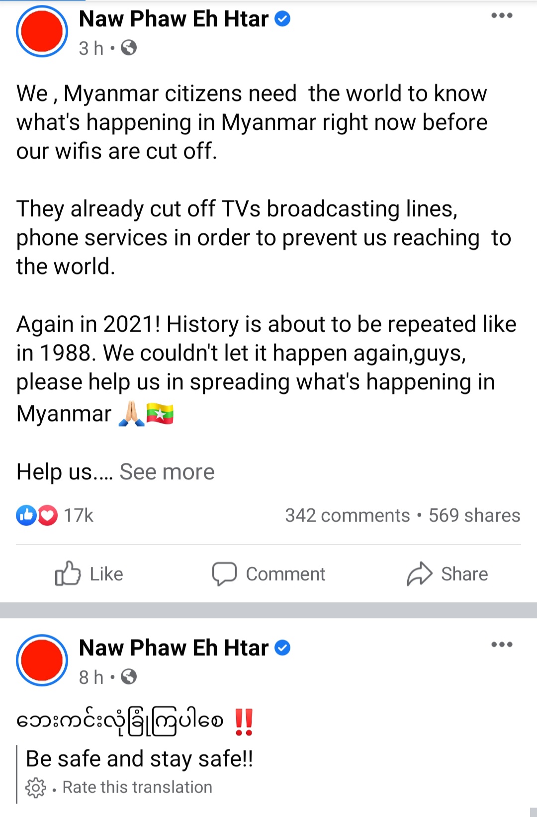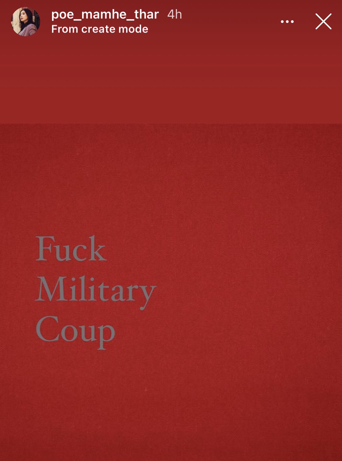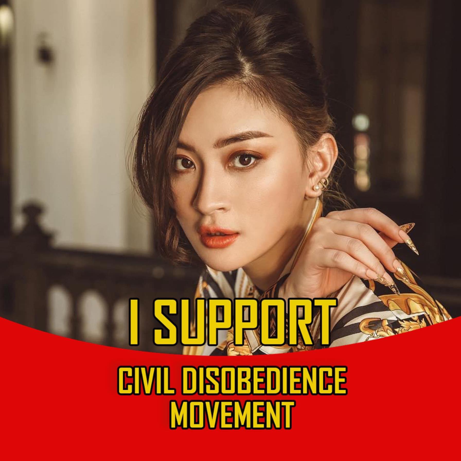 ดาราสาวพม่า เซเลปหลายคนเปิดหน้าเปิดตัว ต่อต้านการรัฐประหารของกองทัพเมียนมาร์ เรียกร้องให้ประชาชนต่อสู้ด้วยวิธีอารยะขัดขืน เพื่อปกป้องประชาธิปไตย โดยไม่แคร์ว่าจะส่งผลกระทบใดๆ ต่อตัวเอง ประเทศกำลังจะพัฒนาในหลายๆ ด้าน แต่อาจจะต้องหยุดชะงักเมื่อเกิดเหตุการณ์แบบนี้