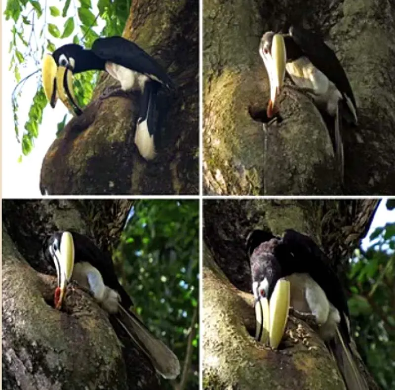 การสร้างความรักของนกเงือกเริ่มจากทั้งคู่จะต้องเลือกสถานที่ทำรังที่เหมาะสม ซึ่งตัวผู้จะทำหน้าที่หาโพรงไม้ที่สัตว์ต่างๆ ได้ทำทิ้งร้างเอาไว้ หรือที่เกิดขึ้นตามธรรมชาติตามต้นไม้สูง เมื่อตัวเมียพอใจกับรังที่ตัวผู้นำเสนอ ตัวเมียจึงยอมให้ผสมพันธุ์แล้วนกทั้งคู่ก็จะช่วยกันหาเศษใบไม้ใบหญ้ามาสร้างรัง ตัวเมียก็จะเข้าไปกกไข่ในโพรง และรอต้อนรับลูกน้อยที่กำลังจะลืมตาดูโลก