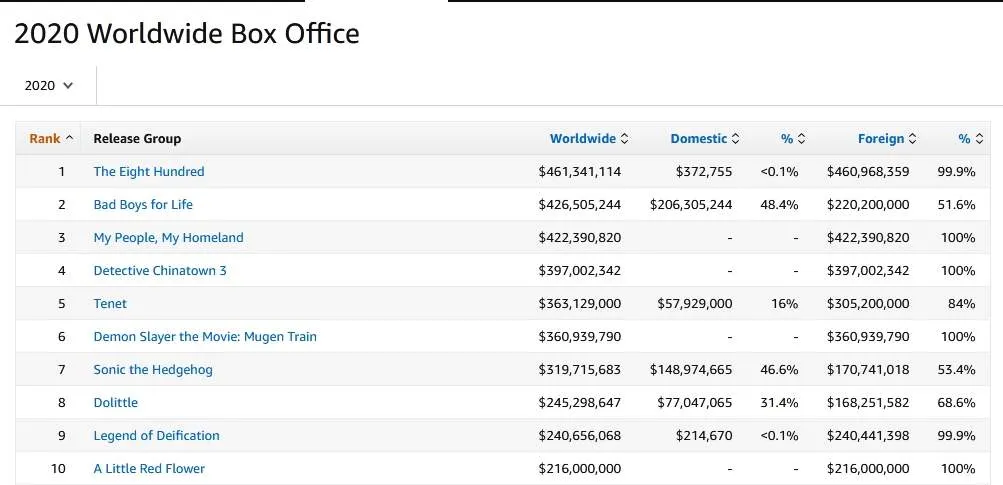 สุดสัปดาห์ที่ผ่านมามีปรากฏการณ์รายได้หนังช็อคโลกอีกครั้งที่เมืองจีน เมื่อ แก๊งม่วนป่วนโตเกียว หรือ Detective Chinatown 3 ที่เลื่อนฉายเพราะพิษโควิด-19 จากตรุษจีนปีที่แล้วมาเป็นตรุษจีนปีนี้ เปิดตัวสุดสัปดาห์แรกได้สูงถึง 397 ล้านเหรียญสหรัฐฯ ทำให้ตัวเลขอันดับหนังทำเงินสูงสุดของโลกประจำปี 2020 เปลี่ยนแปลงทันทีใน Top 5 โดยเรื่องนี้แทรกเข้ามาเป็นอันดับที่ 4 แทนที่ TENET ที่ทำเงินตลอดโปรแกรมไป 363 ล้าน