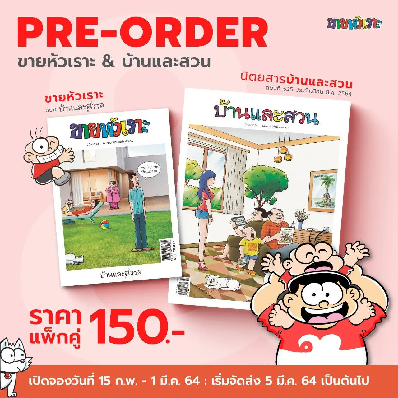 สามารถ Pre-Order นิตยสารบ้านและสวน ฉบับที่ 535 ประจำเดือน มีนาคม 2564 + นิตยสารขายหัวเราะ ฉบับ บ้านและสรวล ราคา 150 บาท ได้ทาง https://www.naiin.com/category?bannerid=4608 หรือร้านหนังสือนายอินทร์ทุกสาขา ตั้งแต่วันนี้-1มีนาคม 2564