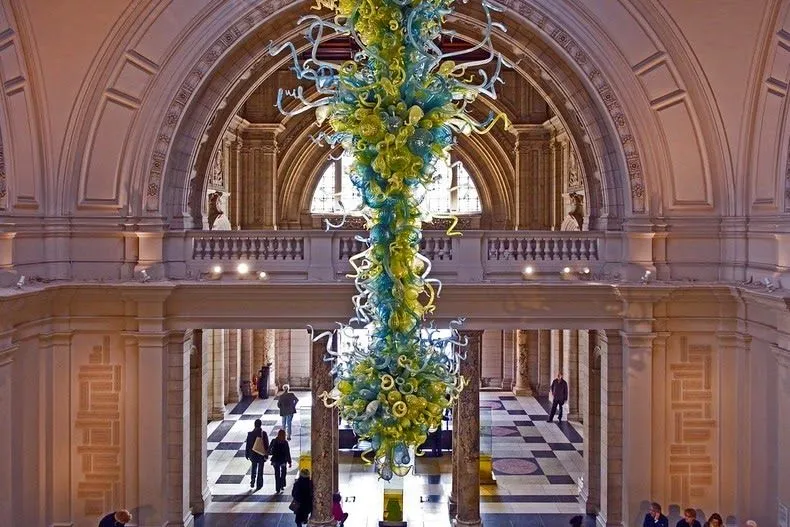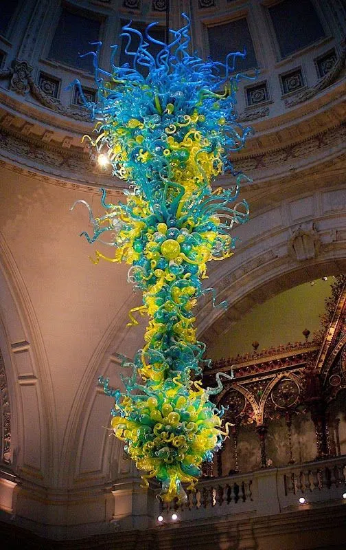 คมระย้าอันงดงามแขวนอยู่ใต้โดมทางเข้าหลักของพิพิธภัณฑ์วิกตอเรียแอนด์อัลเบิร์ตในลอนดอนซึ่งเป็นพิพิธภัณฑ์มัณฑนศิลป์และการออกแบบที่ใหญ่ที่สุดในโลก การระเบิดของแก้วสีน้ำเงินสีเขียวและสีเหลืองที่ยิ่งใหญ่นั้นดูคล้ายกับสิ่งมีชีวิตบางชนิด - อาจเป็นปลาหมึกยักษ์ที่มีหนวดที่บิดงอซึ่งเป็นเครื่องหมายการค้าที่มีลักษณะเฉพาะของประติมากรชาวอเมริกันDale Chihulyซึ่งได้ออกแบบประติมากรรมที่คล้ายกันในที่อื่น แต่โคมระย้าที่ Scotts Square เป็นผลงานที่ได้รับการยอมรับมากที่สุดของเขา โคมระย้าถูกติดตั้งครั้งแรกในปี 2542 ซึ่งในเวลานั้นมีความเรียบง่ายกว่า แต่ Chihuly ตัดสินใจว่าจะต้องใหญ่ขึ้นและขยายให้ใหญ่ขึ้นเพื่อที่ตอนนี้จะเต็มไปด้วยหอกกลางที่ทางเข้าพิพิธภัณฑ์